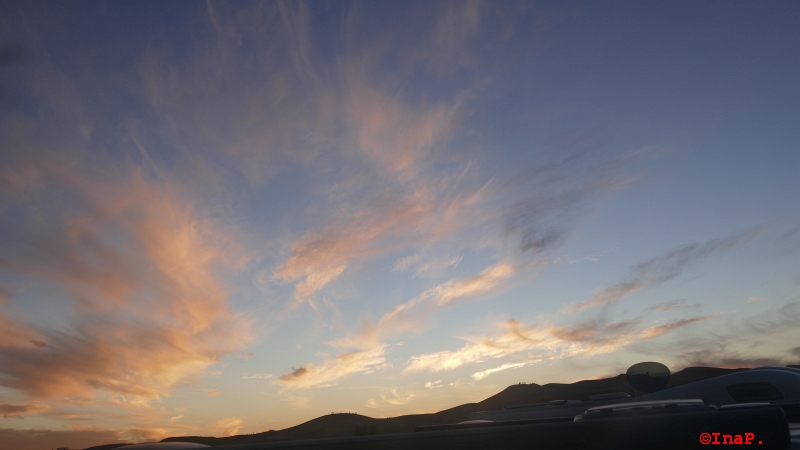 Am frühen Morgen vom Alkoven Fenster heraus, das sind Wolken, schon lange keine mehr gesehen , wer genau schaut kann auf den Dünen schon Menschen sehen, die sind zwischen halb sieben und um sieben schon los gelaufen um den Sonnenuntergang an zu schauen. Naja, uns war es zu früh, war ja erst zwei als Ruhe war und ich schlafen konnte