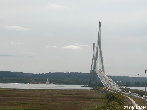 Schon weit vorher war ich leicht nervös, ist ja doch recht weit vom Boden weg. Hat sich aber gelohnt. Die gute an der Kasse hat mir Kategorie 1 berechnet und ich bin für 5€ drüber. Drüben noch mal halt gemacht und Fotografiert, dann zu früh abgebogen L und endlich in Le Havre am Hafen gewesen. War nicht mein Ding, gar nicht. Sie haben einen neuen SP angelegt am Terminal dÍrland, alles schön mit Zaun drum, wie ich es ja liebe, klein, eng und voll. Entsorgung und der Platz selber wohl kostenlos, aber 10 Min Wasser oder auch 55 Min Strom 5€.