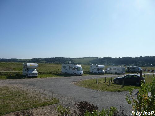 Fahre runter und bin schon zufrieden. Sieht zwar bisschen urtümlich aus, die haben Steinhäufen als Abtrennungen und einen extra Womo Sp in einer Ecke. Der Boden ist grober Kies, aber eben und eine schöne kleine Bucht. War Ebbe und man sah den Sandstrand, bei Flut muss man leider mit Kies vorlieb nehmen. Hinter einem die Klippen……... Mir gefällts hier gut.