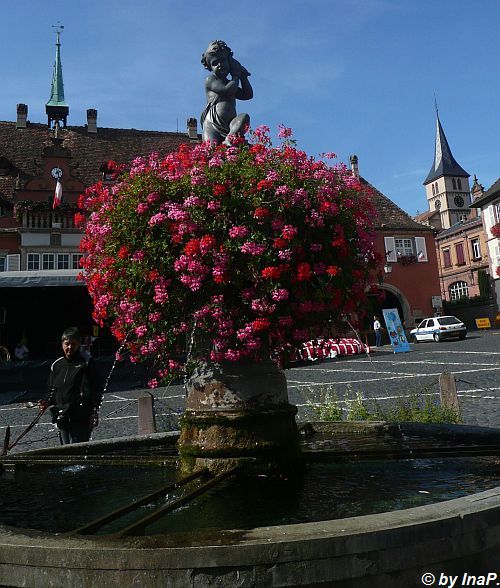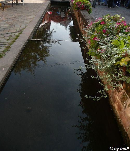 Der Brunnen vor dem Rathaus. Da schwimmen Fische drin unter anderem auch riesige Karpfen.