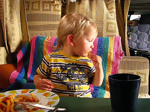 Beim zurück laufen schlief Marci im Wagen ein und schlief auch am Womo weiter, trotzdem ein paar Meter weiter Holzfäller an der Arbeit waren. Ich mich Buch in die Sonne und Beine hoch. Als der kleine wieder wach war was gegessen und dann auf die Wiese gegenüber