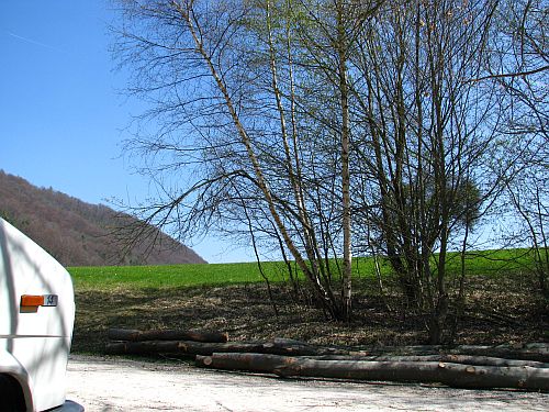 Scheinte die Sonne schon kurz vor sieben, J war aber klirrend kalt, im Führerhaus nur 3°! So gegen neun ging´s dann und ich bin mit den Stöcken los, diesmal rechts ab den Buggel J hoch, der Weg führte durch und an einem Golfplatz vorbei und nach einer Stunde war ich wieder am Womo, gemütlich mit Ei gefrühstückt, mal wieder gelesen, die Ruhe und die Aussicht genossen, Tatsache wieder bisschen eingenickt, aber dann wurde es in der Sonne zu heiß, im Schatten zu kalt, rein und plötzlich Lust bekommen groß reine zu machen J nachdem alles blitze blank war bin ich los zum Bärlauch