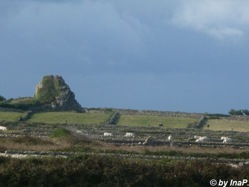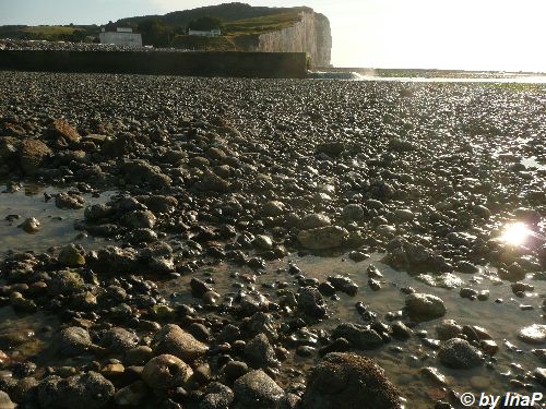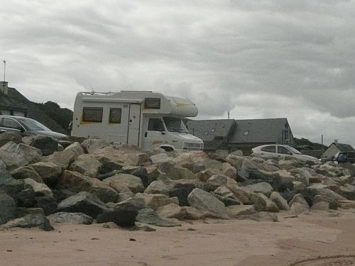 Fahre runter und bin schon zufrieden. Sieht zwar bisschen urtümlich aus, die haben Steinhäufen als Abtrennungen und einen extra Womo Sp in einer Ecke. Der Boden ist grober Kies, aber eben und eine schöne kleine Bucht. War Ebbe und man sah den Sandstrand, bei Flut muss man leider mit Kies vorlieb nehmen. Hinter einem die Klippen……... Mir gefällts hier gut.