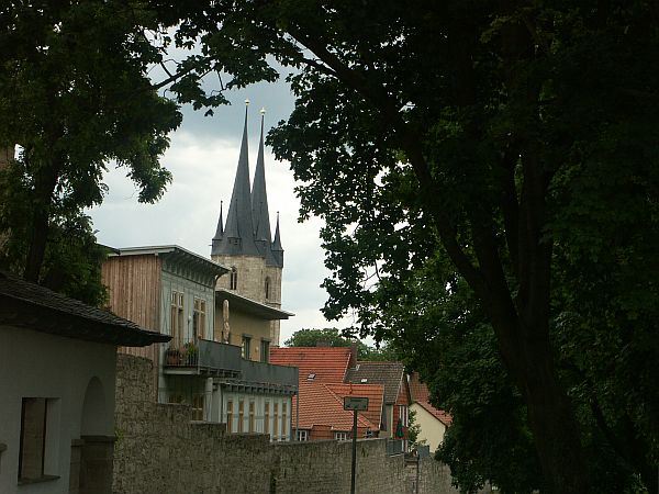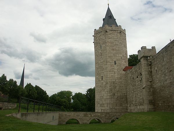 ein Wachturm. Auf der Mauer haben findige Mühlhäuser noch Gartenhäuschen