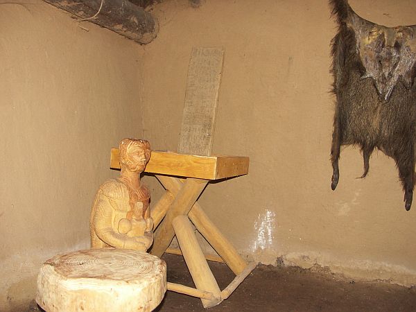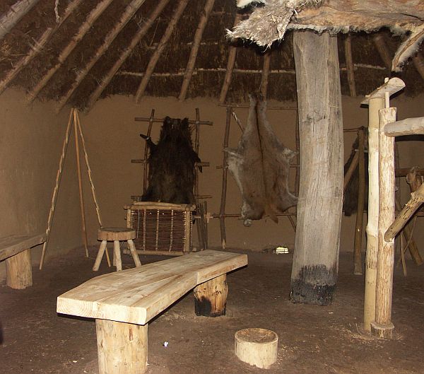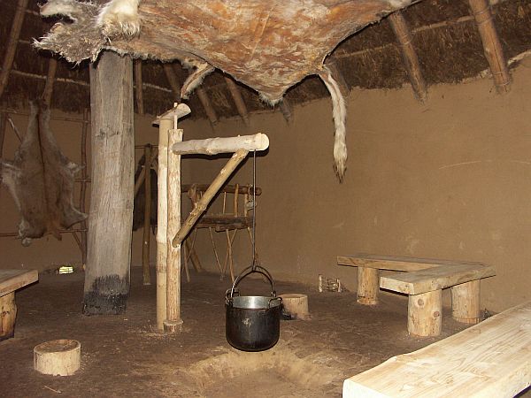 Wohnstallhaus. Rechts die Menschen, links das Vieh