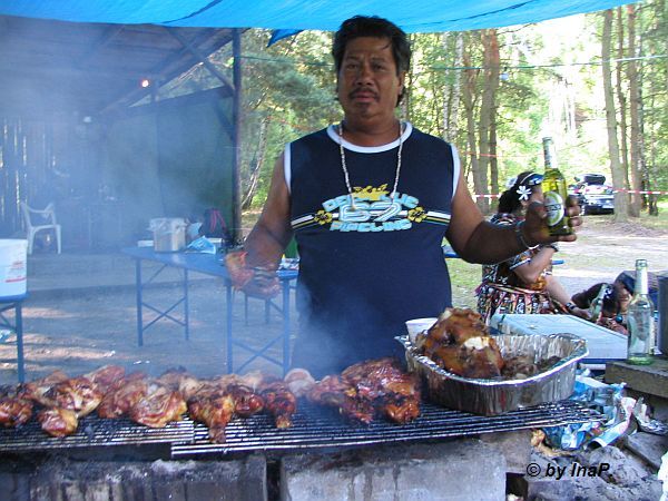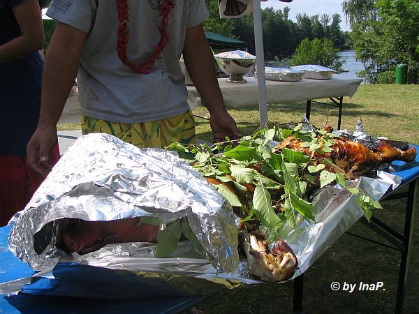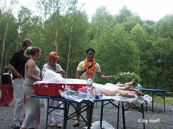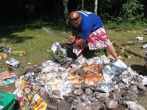 habe ich Tatsache verschlafen........ und war so gegen 10.00 auf dem Festgelände. Tradition wurde dieses Wochenende mal wieder gross geschrieben so auch mit dem Zubereiten der Mahlzeiten und große Stücke Fleisch, am liebsten kleine Schweine, werden da in einem Umu, dem Erdbackofen zubereitet.